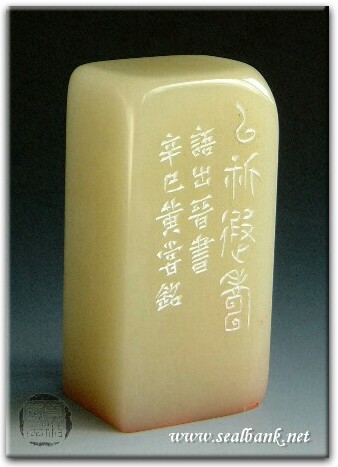 黃嘗銘.四十八歲/刻〔以祈遐壽〕長方白文印。邊款為【以祈遐壽。語出晉書。辛巳,黃嘗銘。】芙蓉石。