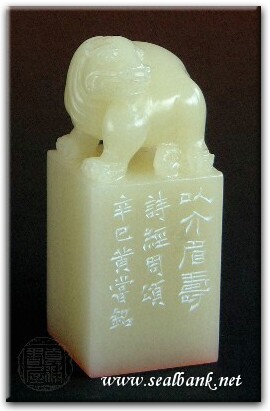 黃嘗銘.四十八歲/刻〔以介眉壽〕正方白文縱格印。邊款為【以介眉壽。《詩經.周頌》。辛巳,黃嘗銘。】芙蓉石。