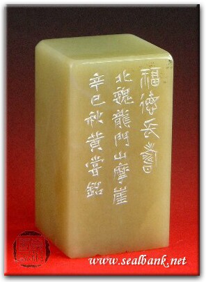 黃嘗銘.四十八歲/刻〔福德長壽〕正方滿白文印。邊款為【福德長壽。北魏龍門山摩崖。辛巳秋,黃嘗銘。】青田凍。