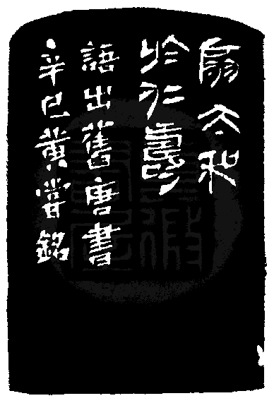 黃嘗銘.四十八歲/刻〔扇太和於仁壽〕長方朱文印。邊款為【扇太和於仁壽。語出舊唐書。辛巳,黃嘗銘。】青田凍。