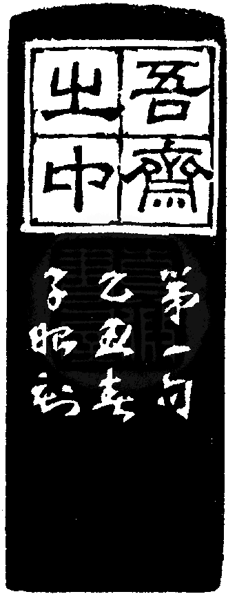 黃嘗銘.卅二歲/刻〔吾齋之中〕正方朱文印。邊款為【吾齋之中。第一句。乙丑春,子昭刻。】原印今藏於林居正。泰來玳瑁。