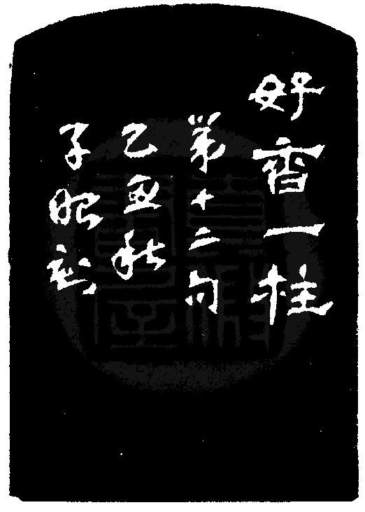 黃嘗銘.卅二歲/刻〔好香一柱〕長方朱文印。邊款為【好香一柱。第十二句。乙丑秋,子昭刻。】原印今藏於林居正。泰來玳瑁。