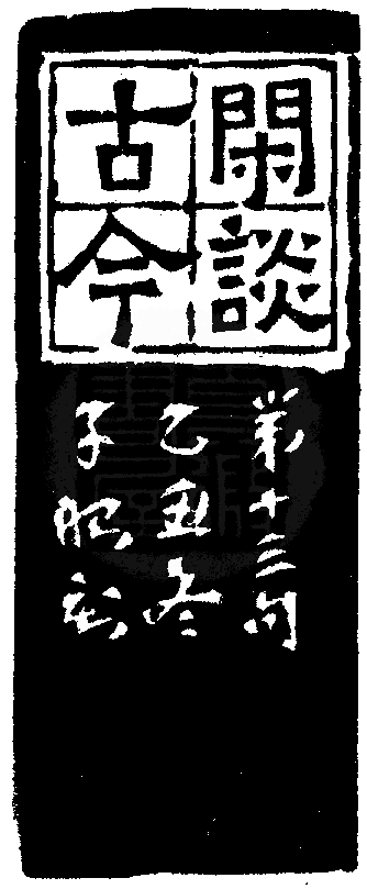 黃嘗銘.卅二歲/刻〔閒談古今〕正方加框白文印。邊款為【閒談古今。第十三句。乙丑冬,子昭刻。】原印今藏於林居正。泰來玳瑁。
