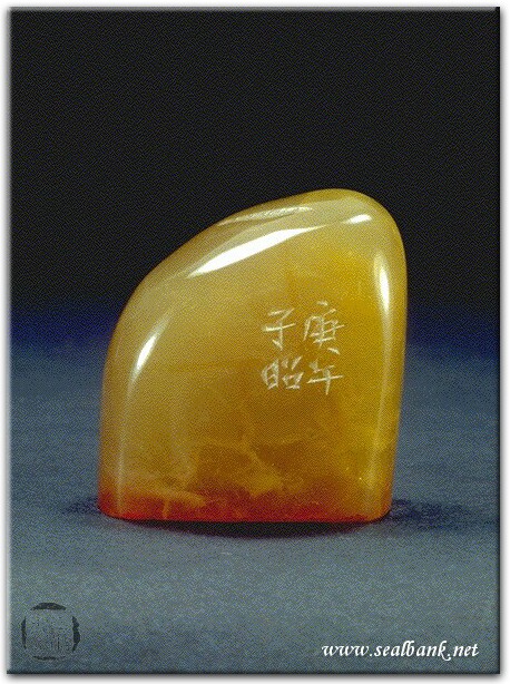 黃嘗銘.卅七歲/刻〔長毋相忘〕自然形朱文印。邊款為【庚午,子昭。】巴林凍。