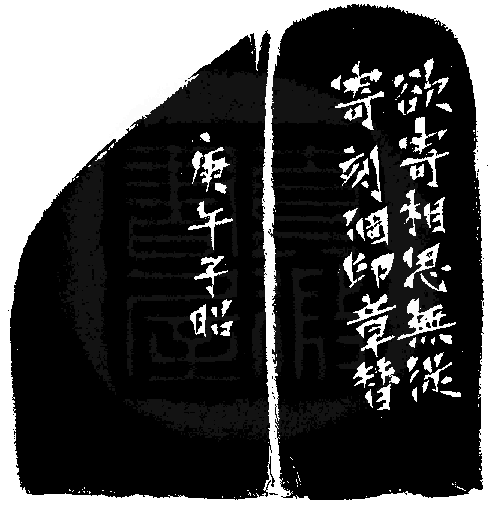 黃嘗銘.卅七歲/刻〔害相思〕自然形加框白文印。邊款為【欲寄相思無從寄,刻個印章替。庚午,子昭。】巴林凍。