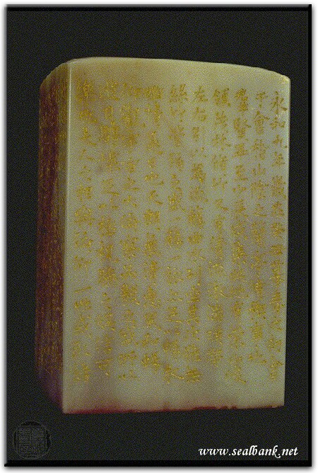 | | 印文:當其欣于所遇暫得于己快然自足不知老之將至 | | 約 橫 4.6 X 豎 5.7 公分 印面圖 邊款圖 | | 黃嘗銘.卅八歲/刻〔當其欣于所遇暫得于己快然自足不知老之將至〕長方加框白文印。邊款為【永和九年,歲在癸丑,暮春之初,會于會稽山陰之蘭亭,脩楔事也。群賢畢至,少長咸集,此地有崇山峻領,茂林脩竹,又有清流激湍,映帶左右,引以為流觴曲水,列坐其次,雖無絲竹管弦之盛,一觴一詠,亦足以暢敘幽情。是日也,天朗氣清,惠風和暢,仰觀宇宙之大,俯察品類之盛,所以遊目騁懷,足以極視聽之娛,信可樂也。夫人之相與,俯仰一世,或取諸懷抱,悟言一室之內,或因寄所託,放浪形骸之外,雖趣舍萬殊,靜躁不同,當其欣於所遇,暫得於己,快然自是,不知老之將至,及其所之既惓,情隨事遷,感慨係之矣。向之所欣,俛仰之間,以為陳跡,猶不能不以之興懷,況脩短隨化,終期於盡,古人云:死生亦大矣,豈不痛哉。每攬昔人興感之由,若合一契,未嘗不臨文嗟悼,不能喻之於懷,固知一死生為虛誕,齊彭殤為妄作,後之視今,亦由今之視昔,悲夫,故列敘時人,錄其所述,雖世殊事異,所以興懷,其致一也。後之攬者,亦將有感於斯文。辛未歲首,拈蘭亭集序數字為印,並以近得長沙汪嘯霞手鉤,蔣疇精勒之定武原拓本為範,錄全文於側。子昭黃嘗銘誌於真微書屋。】巴林雞血。 1991 年刻 |