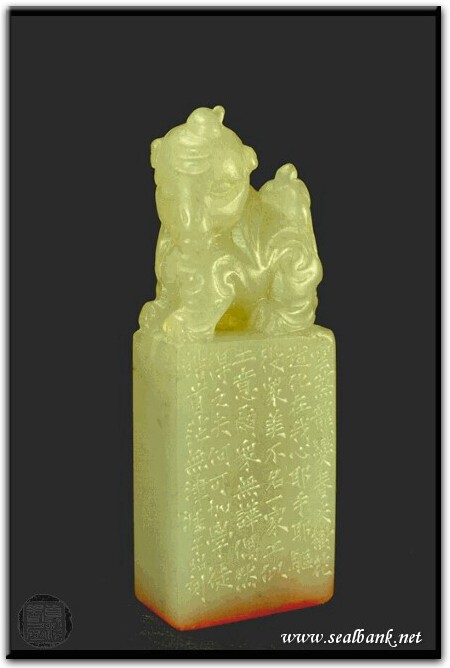 黃嘗銘.卅七歲/刻〔神妙〕長方朱文印。邊款為【雲蒸龍變,春交樹花,造化在我,心耶手耶,驅役眾美,不名一家,工似工意,爾眾無譁,偶然得之,夫何可加,學徒皓首,茫無津涯。子昭刻。】原印今藏於蕭俊卿。荔枝凍。