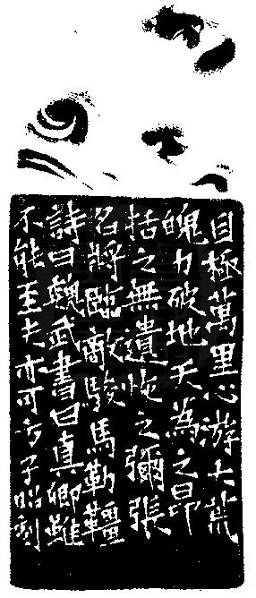 黃嘗銘.卅七歲/刻〔沈雄〕長方滿白文印。邊款為【目極萬里,心游大荒,魄力破地,天為之昂,括之無遺,恢之彌張,名將臨敵,駿馬勒韁,詩曰魏武,書曰真卿,雖不能至,夫亦可方。子昭刻。】原印今藏於蕭俊卿。荔枝凍。