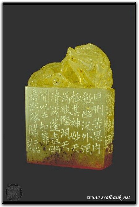 黃嘗銘.卅七歲/刻〔奇辟〕長方加框白文印。邊款為【造境無難,驅亳維艱,猶之理徑,繁蕪用刪,苦思內斂,幽況外頒,極其神妙,天為破慳,洞天清閟,蓬壺幽閒,以手扣扉,□然啟關。子昭刻。】原印今藏於蕭俊卿。荔枝凍。