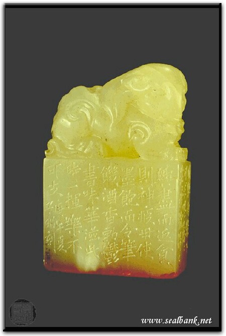 黃嘗銘.卅七歲/刻〔淋漓〕長方白文印。邊款為【風馳雨驟,不可求思,蒼蒼茫茫,我攝得之,興盡而返,貪則神疲,毋使墨飽,而令筆饑,酒香勃鬱,書味華滋,此時一揮,樂不可支。庚午夏,子昭刻。】原印今藏於蕭俊卿。荔枝凍。