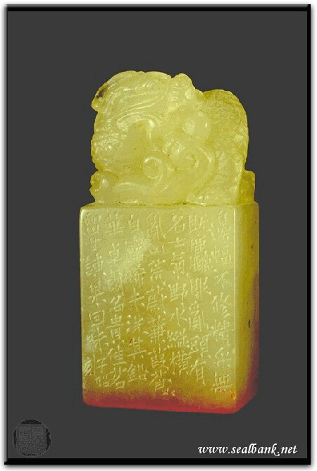 黃嘗銘.卅七歲/刻〔荒寒〕長方朱文印。邊款為【邊幅不修,精采無既,麤服亂頭,有名士氣,野水縱橫,亂山荒蔚,蒹葭蒼蒼,白露晞未,洗其鉛華,卓爾名貴,佳茗留甘,諫果回味。子昭刻。】原印今藏於蕭俊卿。荔枝凍。