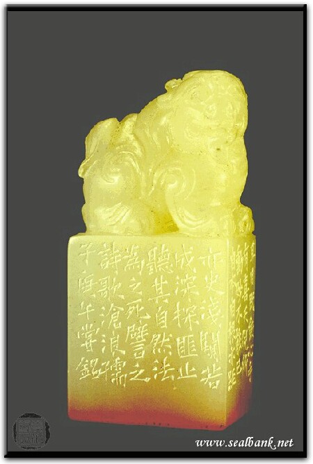 黃嘗銘.卅七歲/刻〔性靈〕長方加框白文印。邊款為【耳目既飫,心手有喜,天倪所動,妙不能已,自本自根,亦經亦史,淺闚若成,深探匪止,聽其自然,法為之死,譬之詩歌,滄浪孺子。庚午,嘗銘。】原印今藏於蕭俊卿。荔枝凍。