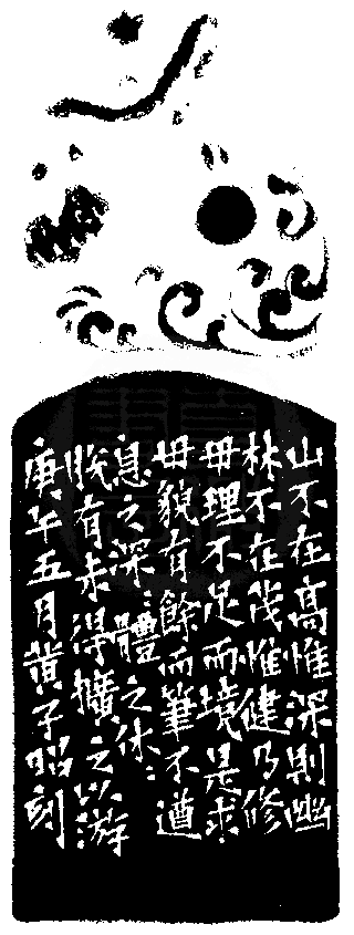 黃嘗銘.卅七歲/刻〔幽邃〕長方細朱文印。邊款為【山不在高,惟深則幽,林不在茂,惟健乃修,毋理不足,而境是求,毋貌有餘,而筆不遒,息息之深,體之休休,脫有未得,擴之以游。庚午五月,黃子昭刻。】原印今藏於蕭俊卿。荔枝凍。