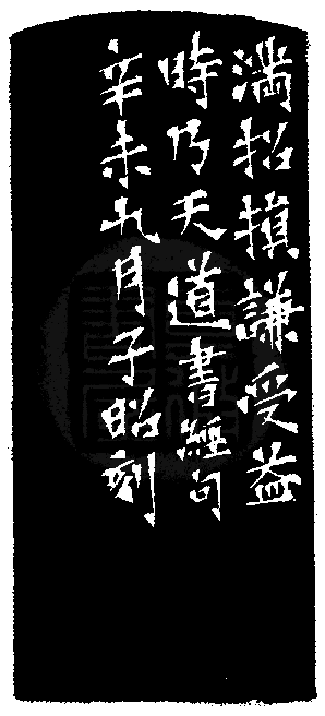 黃嘗銘.卅八歲/刻〔謙益滿損〕正方白文印。邊款為【滿招損,謙受益,時乃天道。書經句。辛未九月,子昭刻。】原印今藏於紀文冠。巴林凍。