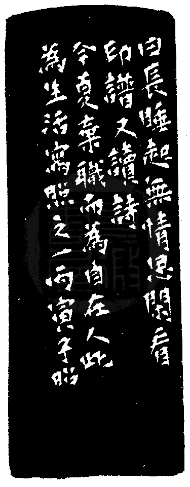 黃嘗銘.卅三歲/刻〔閑自在〕正方朱文印。邊款為【曰長睡起無情思,閑看印譜又讀詩。今夏棄職而為自在人,此為生活寫照之一。丙寅,子昭。】原印今藏於黃嘗銘。泰來石。