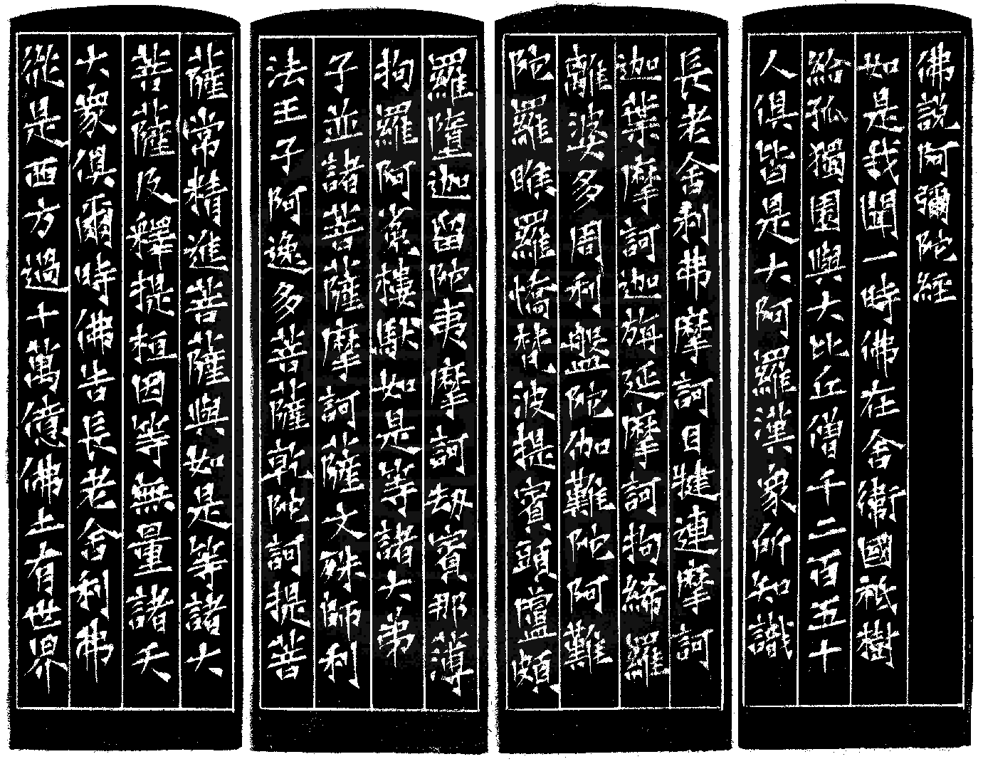 如是我聞。一時佛在舍衛國,祇樹給孤獨園。與大比丘僧,千二百五十人俱,皆是大阿羅漢,眾所知識:長老舍利弗、摩訶目犍連、摩訶迦葉、摩訶迦旃延、摩訶俱絺羅、離婆多、周利槃陀伽、難陀、阿難陀、羅侯羅、憍梵波提、賓頭盧頗羅墮、迦留陀夷、摩訶劫賓那、薄拘羅、阿那樓馱,如是等諸大弟子。并諸菩薩摩訶薩:文殊師利法王子、阿逸多菩薩、乾陀訶提菩薩、常精進菩薩,與如是等諸大菩薩。及釋提桓因等,無量諸天大眾俱。爾時,佛告長老舍利弗:「從是西方,過十萬億佛土,有世界】原印今藏於陳川林。巴林石。 1990 年刻 |
