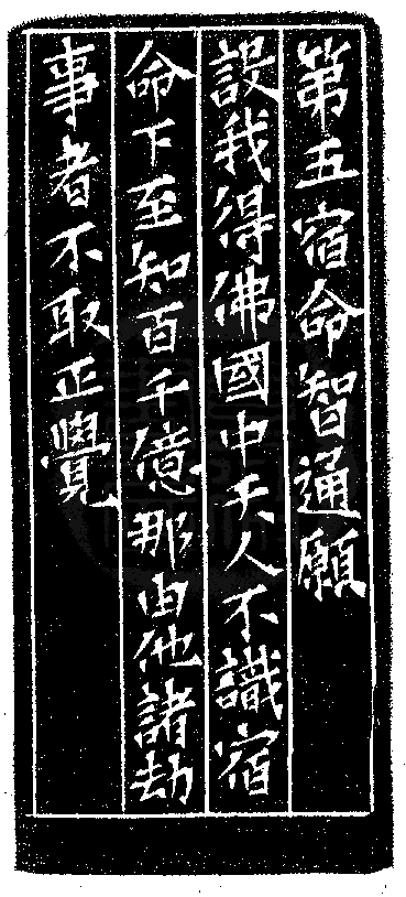 黃嘗銘.卅九歲/刻〔宿命智通〕正方加框白文印。邊款為【第五、宿命智通願。設我得佛,國中天人,不識宿命,下至知百千億那由他諸劫事者,不取正覺。】原印今藏於陳川林。巴林石。