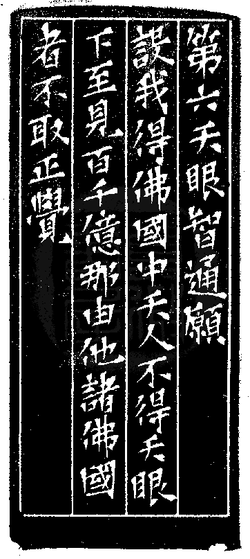 黃嘗銘.卅九歲/刻〔天眼智通〕正方朱文界格印。邊款為【第六、天眼智通願。設我得佛,國中天人,不得天眼,下至見百千億那由他諸佛國者,不取正覺。】原印今藏於陳川林。巴林石。