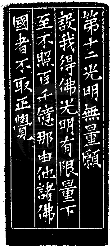 黃嘗銘.卅九歲/刻〔光明無量〕正方朱文縱格印。邊款為【第十二、光明無量願。設我得佛,光明有限量,下至不照百千億那由他諸佛國者,不取正覺。】原印今藏於陳川林。巴林石。