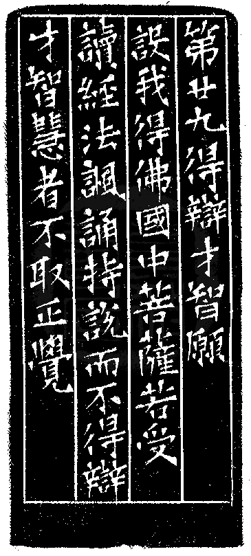 黃嘗銘.卅九歲/刻〔得辯才智〕正方白文界格印。邊款為【第廿九、得辯才智願。設我得佛,國中菩薩,若受讀經法,諷誦持說,而不得辯材智慧者,不取正覺。】原印今藏於陳川林。巴林石。