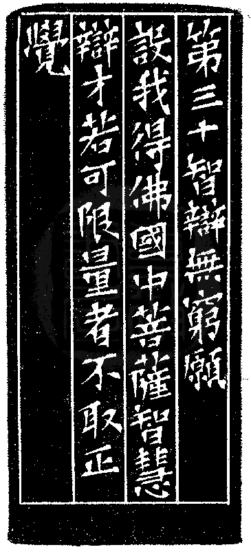 黃嘗銘.卅九歲/刻〔智辯無窮〕正方朱文印。邊款為【第三十、智辯無窮願。設我得佛,國中菩薩,智慧辯材,若可限量者,不取正覺。】原印今藏於陳川林。巴林石。