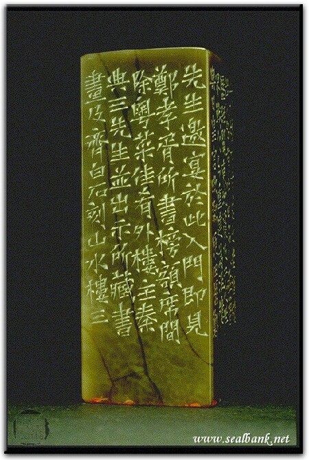 | | 印文:樓會山水白石痕 | | 約 橫 2.7 X 豎 2.8 公分 印面圖 邊款圖 | | 黃嘗銘.四十二歲/刻〔樓會山水白石痕〕正方白文印。邊款為【山水樓乃有名之老酒樓,出入多有中日名人,並曾歷經關東地震及二次世界戰火,今重建為洋樓,與日皇宮毗鄰。原田歷鄭先生邀宴於此,入門即見鄭孝胥所書榜額,席間除粵菜佳餚外,樓主秦典三先生並出示所藏書畫,及齊白石刻山水樓三字印,並允拓得歸,惜拓具未備,於白石二字款,也徒歎呼呼而已。乙亥二月初二,黃嘗銘刻。】巴林凍。 1995 年刻 |