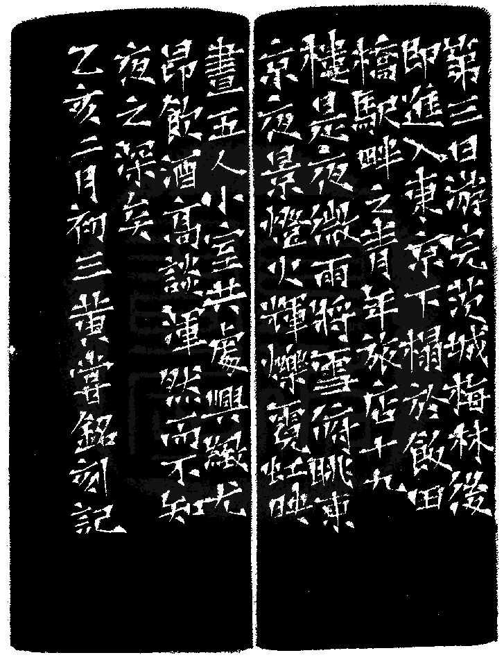 黃嘗銘.四十二歲/刻〔夜廔高飲飯田橋〕正方朱文印。邊款為【第三日,游完茨城梅林後,即進入東京,下榻於飯田橋驛畔之青年旅店十九樓。是夜微雨將雪,俯眺東京夜景,燈火輝爍,霓虹映晝,五人小室共處,興緻尤昂,飲酒高談,渾然而不知夜之深矣。乙亥二月初三,黃嘗銘刻記。】巴林凍。