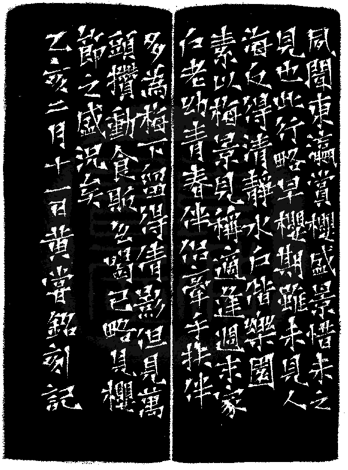 黃嘗銘.四十二歲/刻〔家戶偕樂梅園游〕正方朱文印。邊款為【夙聞東瀛賞櫻盛景,惜未之見也,此行略早櫻期,雖未見人海,反得清靜。水戶偕樂園素以梅景見稱,適逢週末,家戶老幼、青春伴侶,牽手扶伴,多為梅下留得倩影,但見萬頭攢動、食販吆喝,已略見櫻節之盛況矣。乙亥二月十一日、黃嘗銘刻記。】巴林凍。
