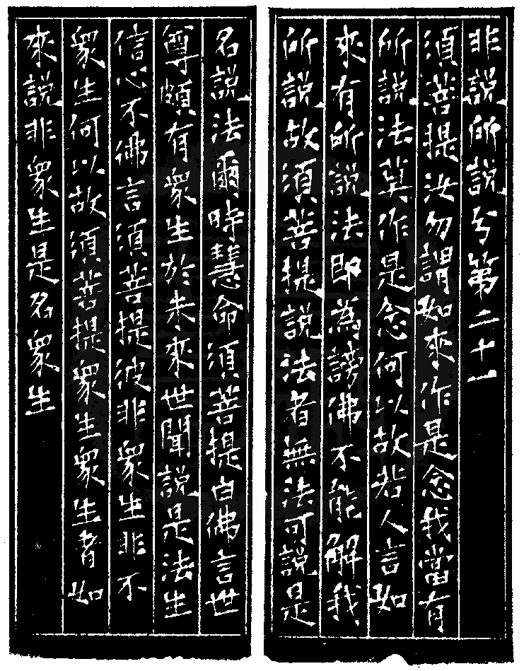 | | 印文:非說所說 | | 約 橫 3.0 X 豎 2.9 公分 印面圖 | | 黃嘗銘.卅五歲/刻〔非說所說〕正方回文朱文印。邊款為【非說所說分第二十一。「須菩提!汝勿謂如來作是念:我當有所說法。莫作是念!何以故?若人言如來有所說法,即為謗佛,不能解我所說故。須菩提!說法者,無法可說,是名說法。」爾時,慧命須菩提白佛言:「世尊!頗有眾生,於未來世,聞說是法,生信心不?」佛言:「須菩提!彼非眾生,非不眾生。何以故?須菩提!眾生眾生者,如來說非眾生,是名眾生。」】原印今藏於陳川林。泰來石。 1988 年刻 |