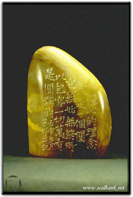 黃嘗銘.卅九歲/刻〔一切圓滿〕自然形朱文印。邊款為【禪心的理念就是一個圓,它無始無終,所以包容一切萬有,是圓滿的。壬申春,子昭並記。】原印今藏於薛道珍。巴林凍。