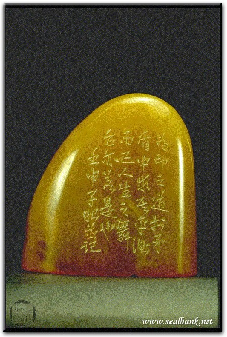 黃嘗銘.卅九歲/刻〔矛盾中求平衡〕自然形朱文印。邊款為【為印之道,於矛盾中求其平衡而已,人生之舞台亦若是也。壬申,子昭並記。】巴林凍。