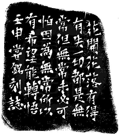 黃嘗銘.卅九歲/刻〔人生無常〕自然形朱文印。邊款為【花開花落,有得有失,一切都是無常,但無常未必可怕,因為無常所以有希望、能轉悟。壬申,嘗銘刻誌。】原印今藏於法鼓山。巴林凍。