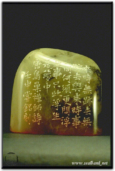 黃嘗銘.卅九歲/刻〔浮生若夢〕自然形朱文印。邊款為【來時無跡去無蹤,去與來時事一同,何須更問浮生事,只此浮生是夢中。唐鳥巢禪師詩。壬申,嘗銘刻。】巴林凍。