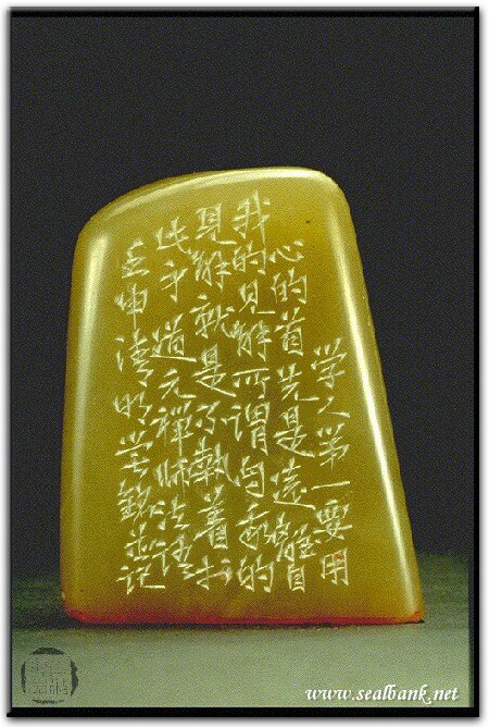 黃嘗銘.卅九歲/刻〔離我見〕自然形朱文印。邊款為【學人第一要用心的,首先是遠離自我的見解,所謂自我的見解,就是不執著於此身。道元禪師法語。壬申清明,嘗銘並記。】原印今藏於法鼓山。巴林凍。