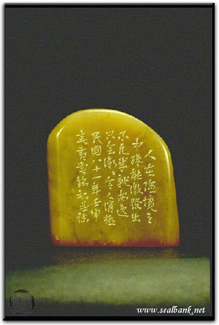 黃嘗銘.卅九歲/刻〔大死而後生〕自然形朱文印。邊款為【人在險境之中纔能激發出不凡成就,安逸只會漸漸令人消極。民國八十一年壬申春,黃嘗銘刻並誌。】巴林凍。