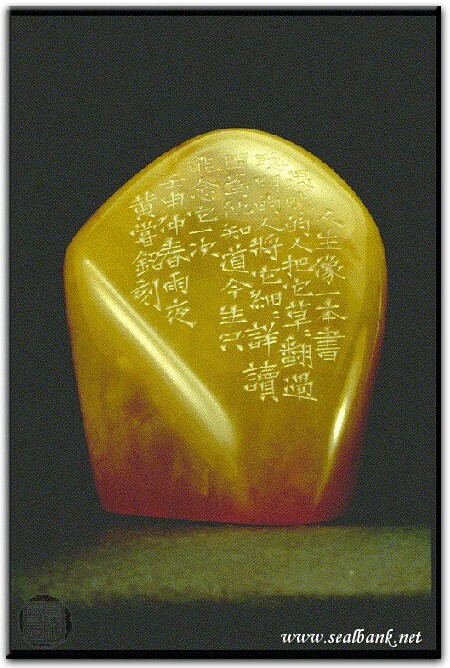 黃嘗銘.卅九歲/刻〔咀嚼人生〕自然形朱文印。邊款為【人生像一本書,愚昧的人把它草草翻過,聰明的人將它細細詳讀,因為他知道今生只能念它一次。壬申仲春雨夜,黃嘗銘刻。】巴林凍。