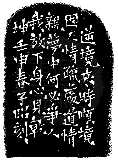 黃嘗銘.卅九歲/刻〔心存逆境〕自然形朱文印。邊款為【逆境來時順境因,人情疏處道情親,夢中何必爭人我,放下身心見乾坤。壬申春,子昭刻。】原印今藏於許英振。巴林凍。