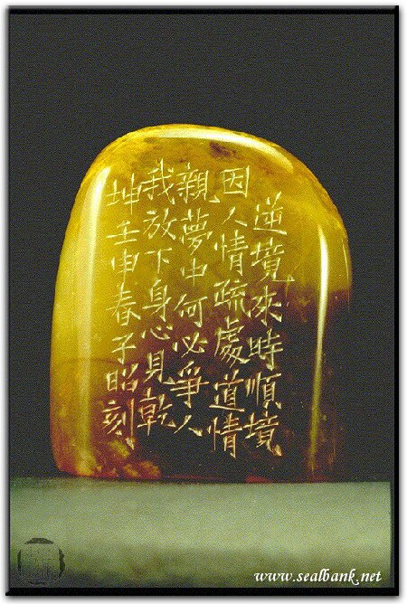 黃嘗銘.卅九歲/刻〔心存逆境〕自然形朱文印。邊款為【逆境來時順境因,人情疏處道情親,夢中何必爭人我,放下身心見乾坤。壬申春,子昭刻。】原印今藏於許英振。巴林凍。