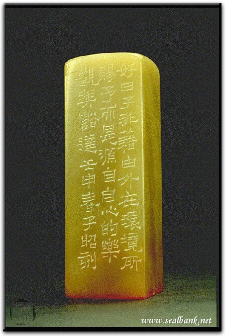 黃嘗銘.卅九歲/刻〔日日吉日〕正方朱白文印。邊款為【好日子非藉由外在環境所賜予,而是源自自心的樂觀與豁達。壬申春,子昭刻。】原印今藏於鄒玫。巴林凍。