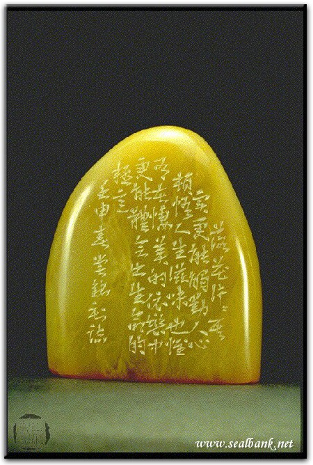 黃嘗銘.卅九歲/刻〔落花有意〕自然形朱文印。邊款為【落花片片,其實更能觸動人心,頓悟人生滋味,也惟有在悽美的依戀中,更能體會出生命的極意。壬申春,嘗銘刻誌。】原印今藏於石汝銘。巴林凍。