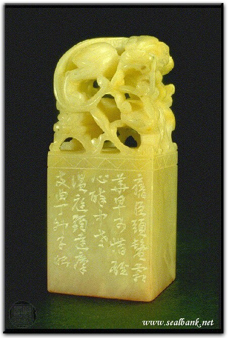 黃嘗銘.卅四歲/刻〔可惜雄心醉中老〕長方白文印。邊款為【舊臣頭鬢霜華早,可惜雄心醉中老。溫庭筠達摩支曲。丁卯,子昭。】巴林石。