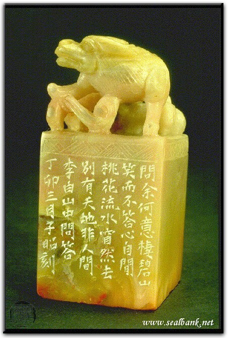 黃嘗銘.卅四歲/刻〔別有天地非人間〕正方白文印。邊款為【問余何意棲碧山,笑而不答心自閒,桃花流水窅然去,別有天地非人間。李白山中問答。丁卯三月,子昭刻。】巴林石。