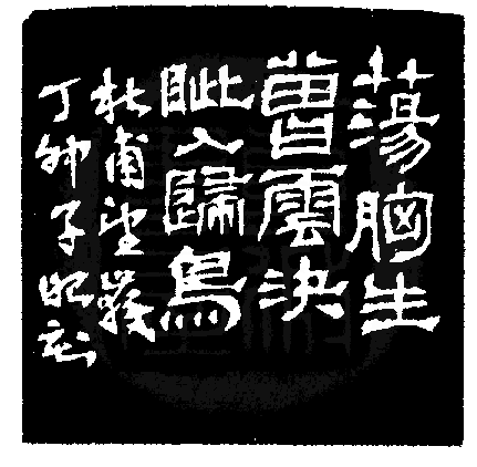 黃嘗銘.卅四歲/刻〔蕩胸生曾雲〕長方朱文印。邊款為【蕩胸生曾雲,決眥入歸鳥。杜甫望嶽。丁卯,子昭刻。】巴林石。