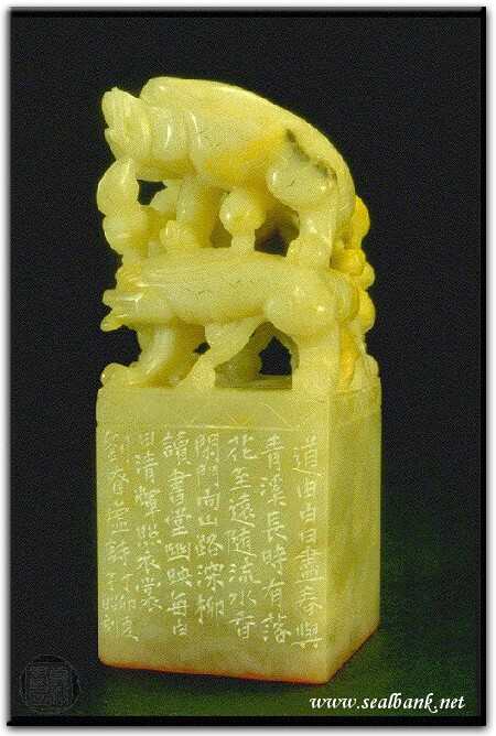 黃嘗銘.卅四歲/刻〔閒門向山路深柳讀書堂〕正方朱文縱格印。邊款為【道由白日盡,春與青溪長,時有落花至,遠隨流水香。閑門向山路,深柳讀書堂,幽映每白日,清輝照衣裳。劉□虛詩。丁卯夏,子昭刻。】巴林石。