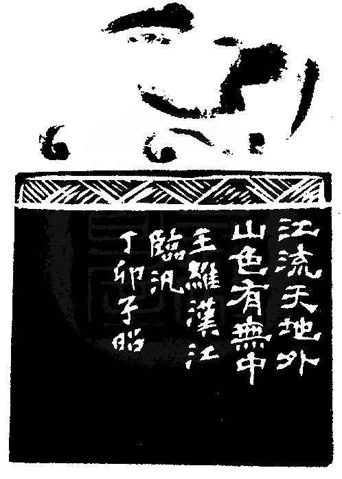 黃嘗銘.卅四歲/刻〔山色有無中〕長方白文印。邊款為【江流天地外,山色有無中。王維漢江臨汎。丁卯,子昭。】巴林石。