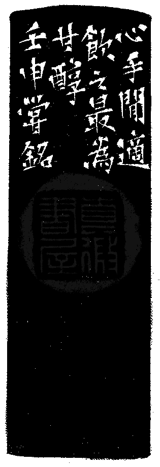 黃嘗銘.卅九歲/刻〔心手閒適〕正方白文縱格印。邊款為【心手閒適,飲之最為甘醇。壬申,嘗銘。】原印今藏於陳川林。巴林凍。