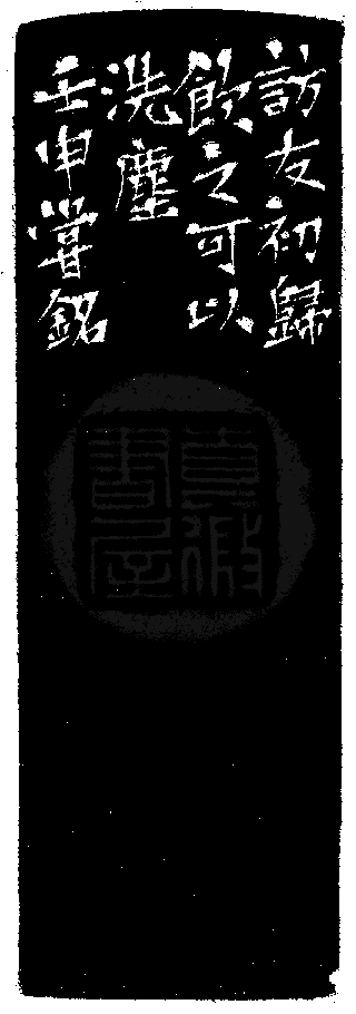 黃嘗銘.卅九歲/刻〔訪友初歸〕正方加框白文印。邊款為【訪友初歸,飲之可以洗塵。壬申,嘗銘。】原印今藏於陳川林。巴林凍。