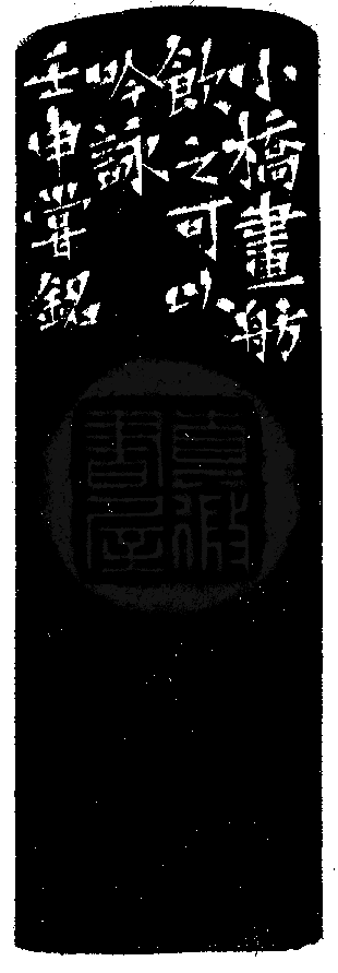 黃嘗銘.卅九歲/刻〔小橋畫舫〕正方朱文印。邊款為【小橋畫舫,飲之可以吟詠。壬申,嘗銘。】原印今藏於陳川林。巴林凍。
