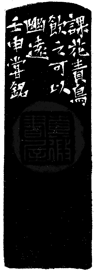 黃嘗銘.卅九歲/刻〔課花責鳥〕正方朱文縱格印。邊款為【課花責鳥,飲之可以幽遠。壬申,嘗銘。】原印今藏於陳川林。巴林凍。
