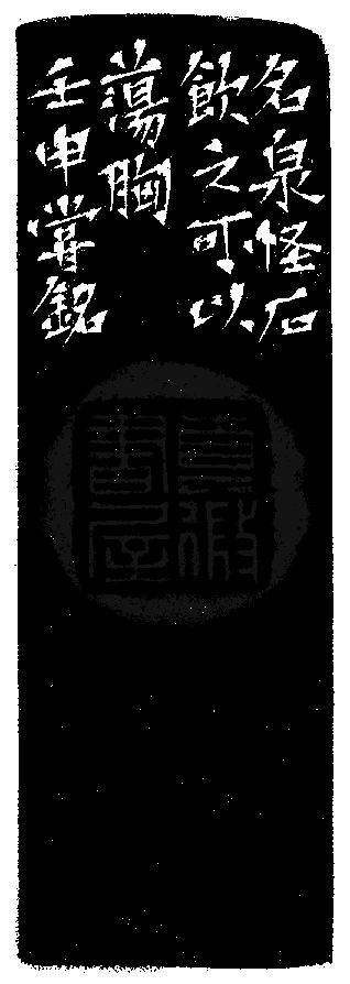 黃嘗銘.卅九歲/刻〔名泉怪石〕正方加框白文印。邊款為【名泉怪石,飲之可以蕩胸。壬申,嘗銘。】原印今藏於陳川林。巴林凍。